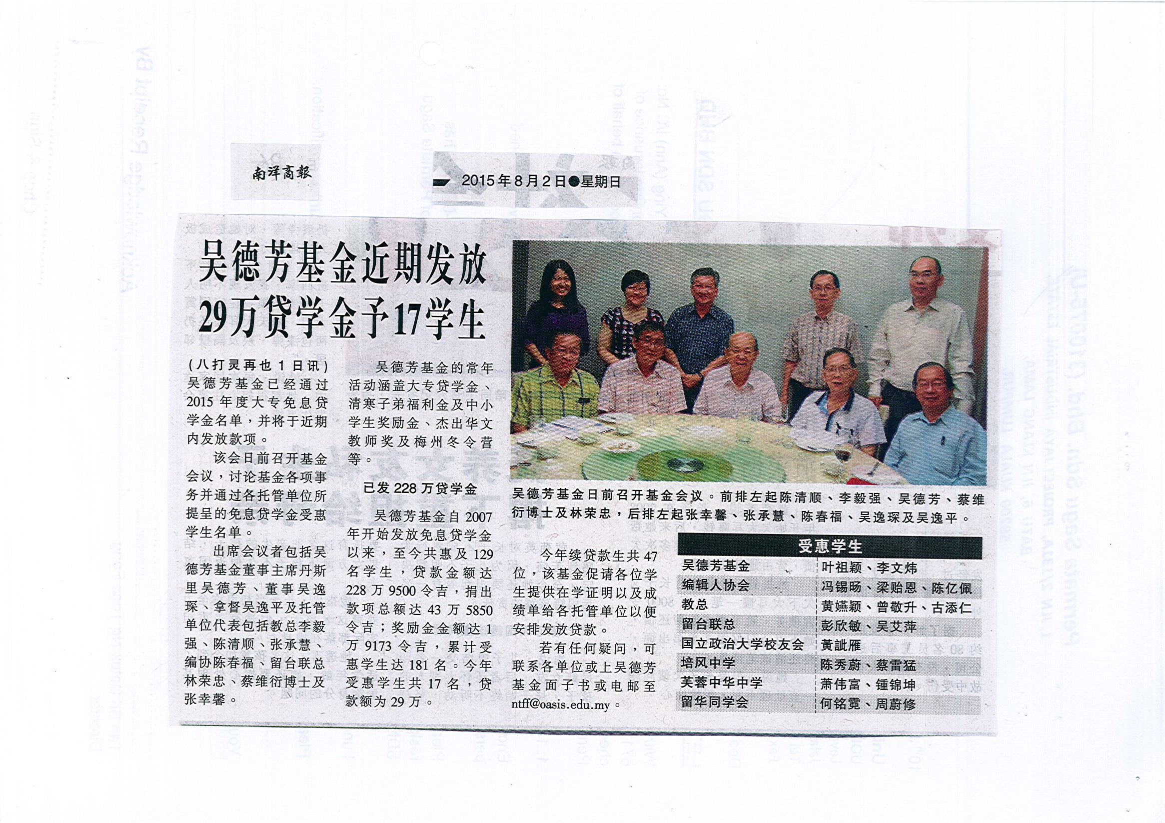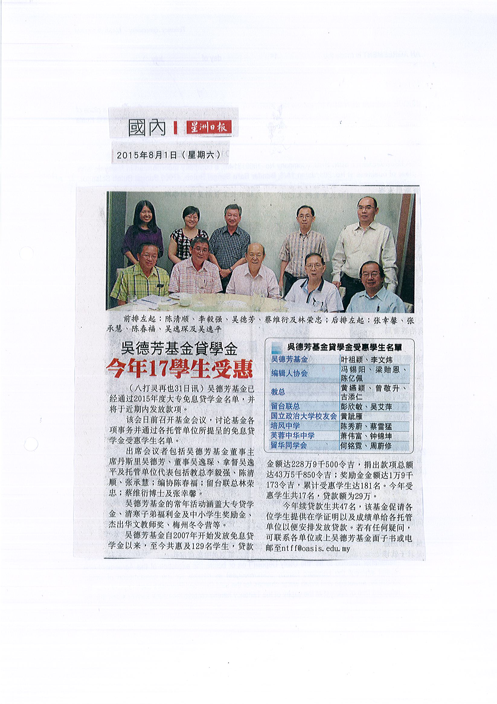 2015年吳德芳基金大專免息貸學金錄取名單